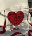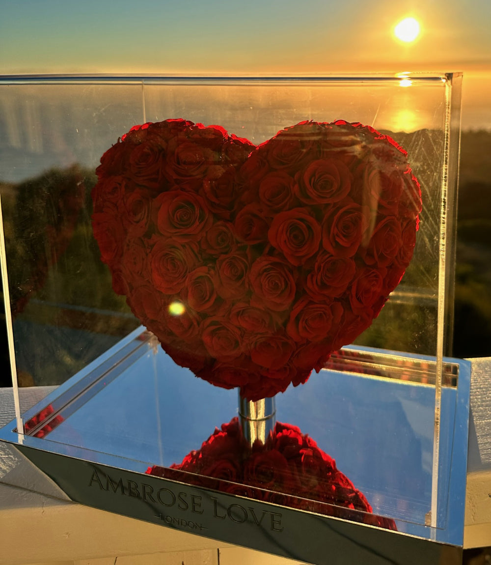 The heart rises majestically from a bed of vibrant petals, cradled within a contemporary clear acrylic case that allows the intensity of the roses to shine from every perspective. The polished mirrored base inside the case adds a touch of luxury, enhancing the roses' natural splendor.