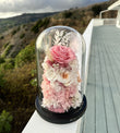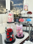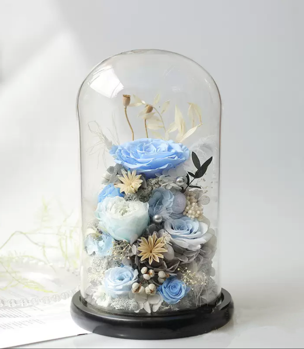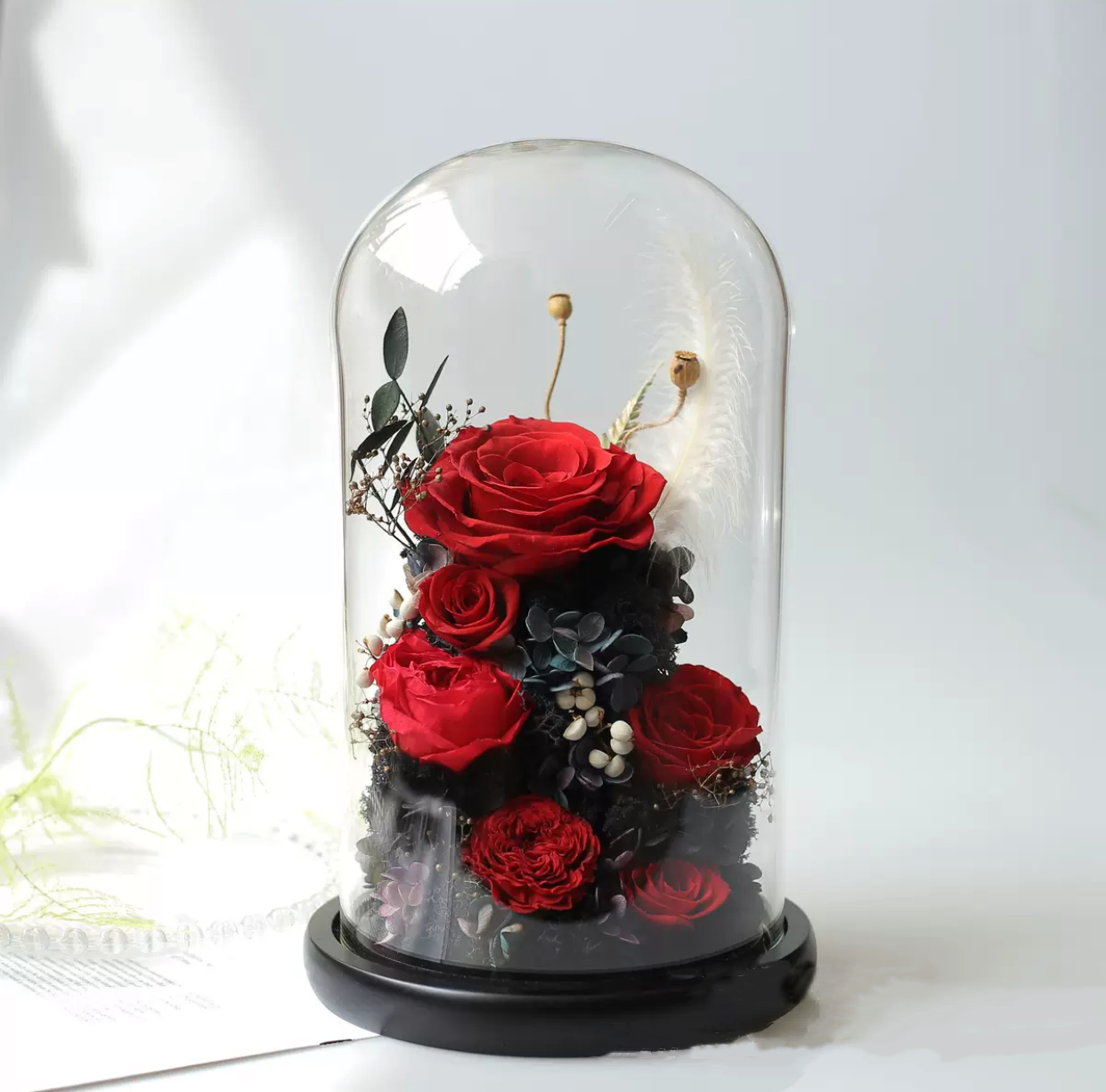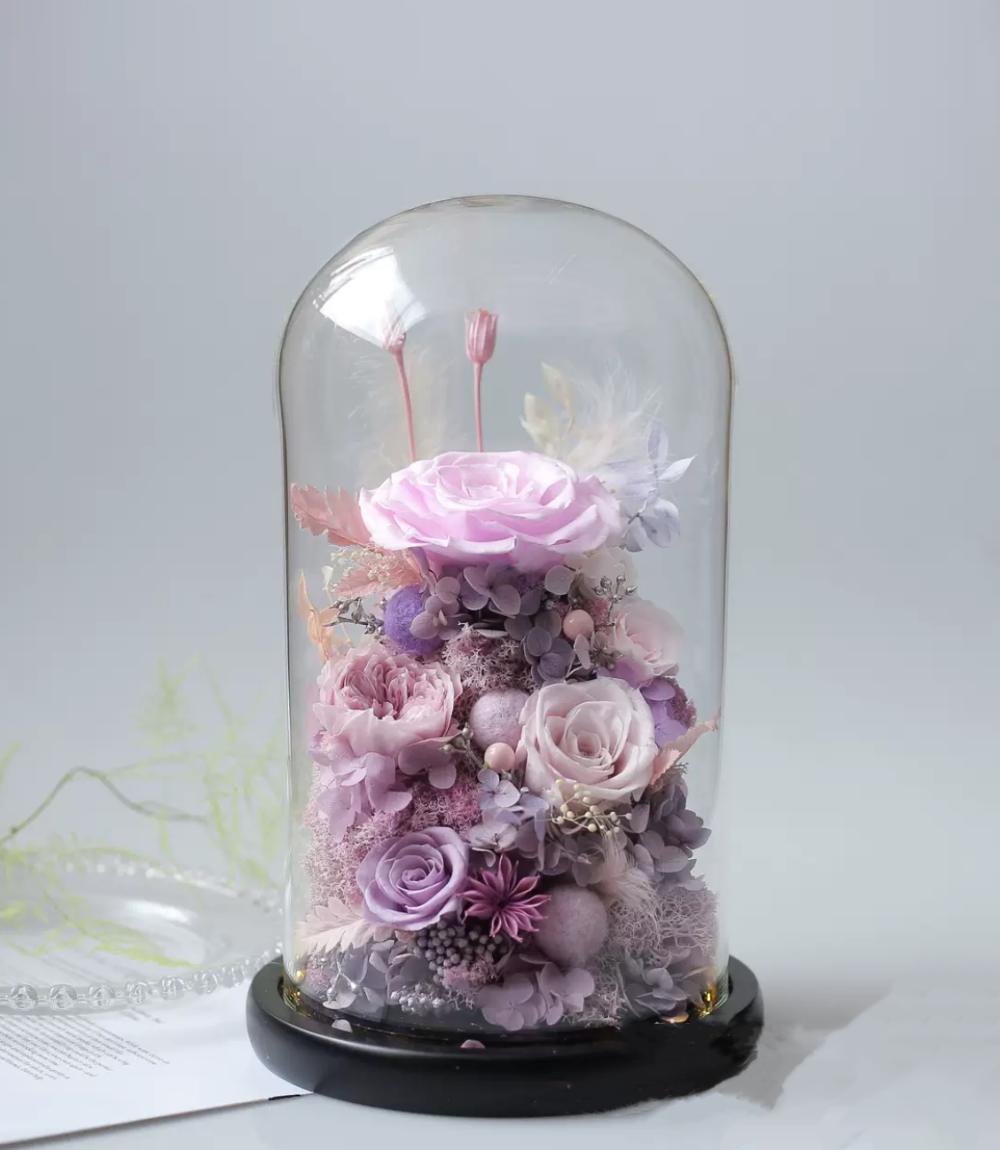 The dome, sitting atop a sleek black base, serves as a stage for these eternal blooms, each meticulously preserved to capture the essence of a serene garden. It’s a display that marries the fragility of a petal with the permanence of love, making it an everlasting gift or an elegant statement piece for any interior.