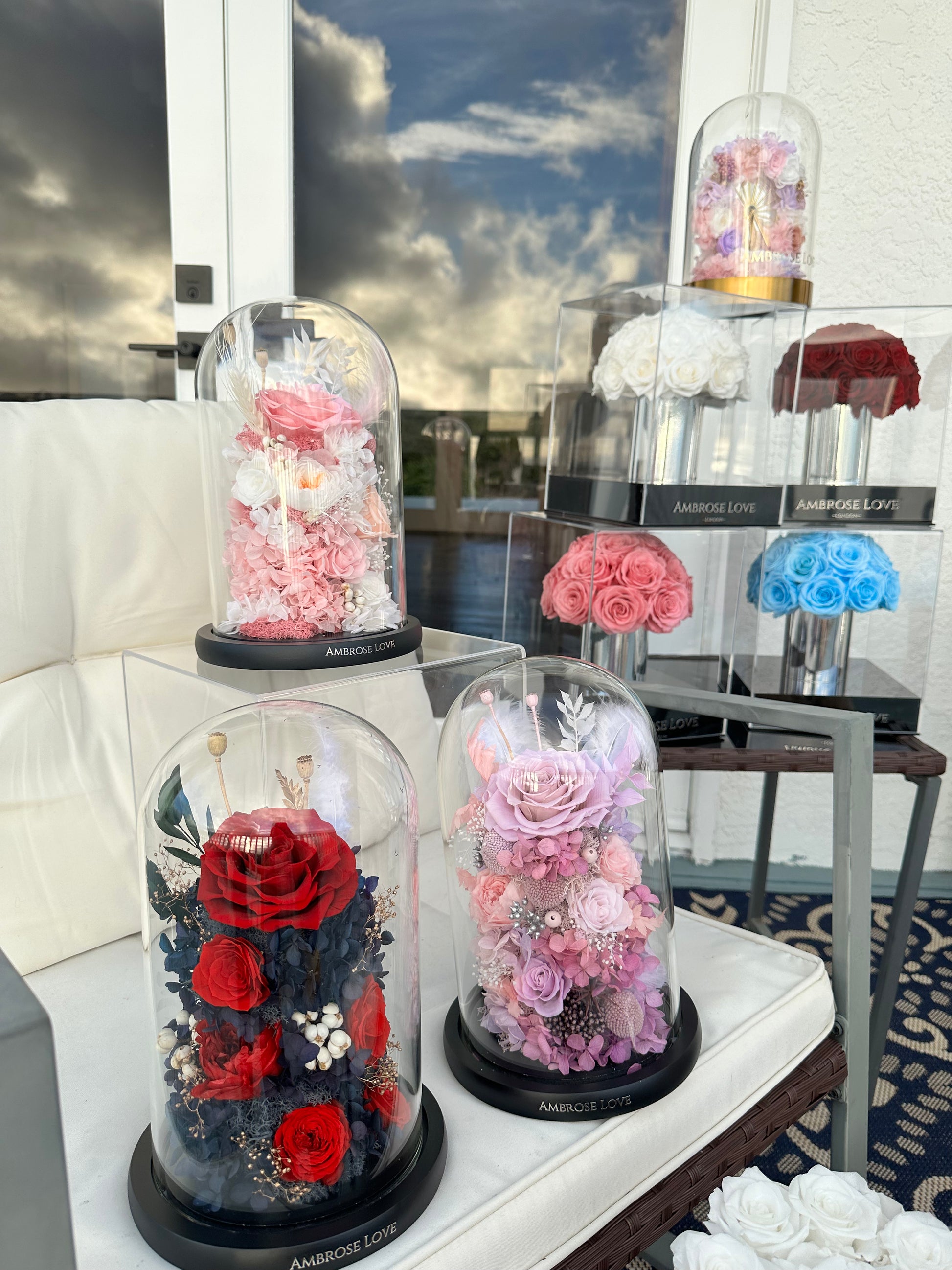 Encased in a transparent glass dome to showcase the flowers’ full beauty